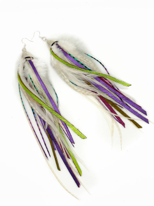 Long Bohemian Feather & Leather Earrings - Olympic Fireworks