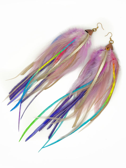 Long Bohemian Feather & Leather Earrings - Rainbow Raindrops