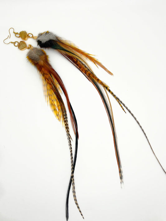 Long Brown Feather Earrings - Orange Citrine Gemstones